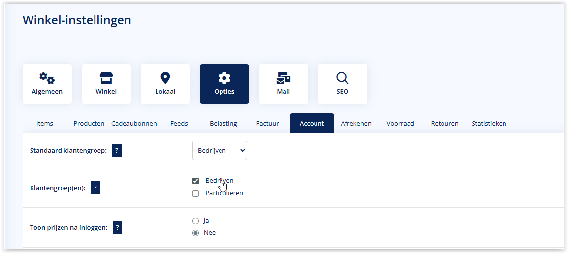 Hieronder zie je wat je meestal instelt bij een B2B webshop: