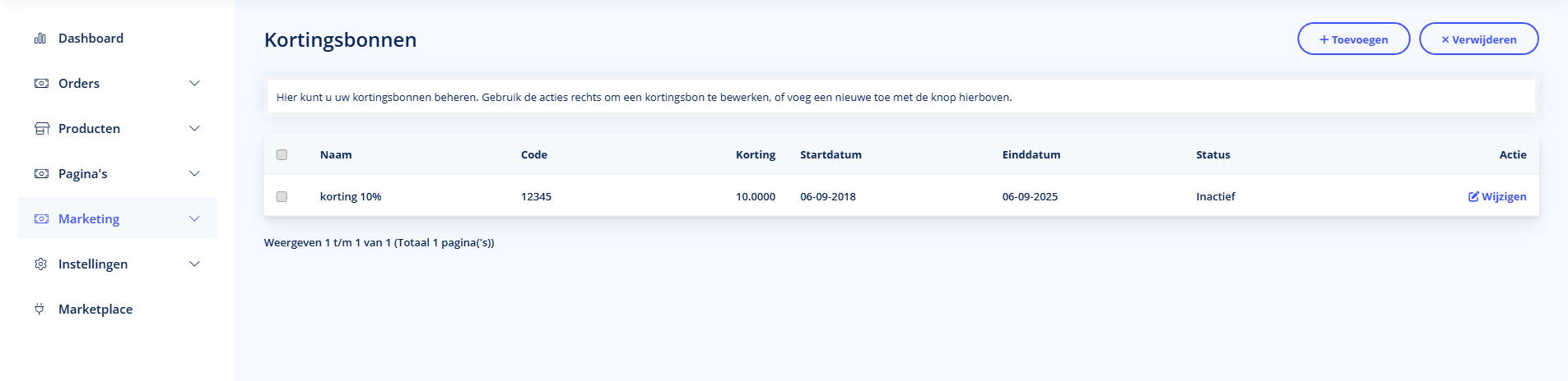 Onder Marketing vind je tools om je webshop te promoten en klanten te belonen.