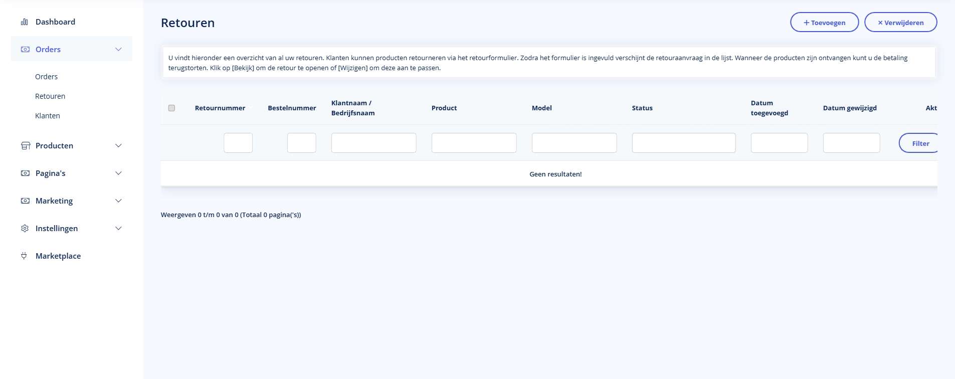 Soms wil een klant een product retourneren. In TheShopBuilders kun je retouren eenvoudig beheren via Orders → Retouren.