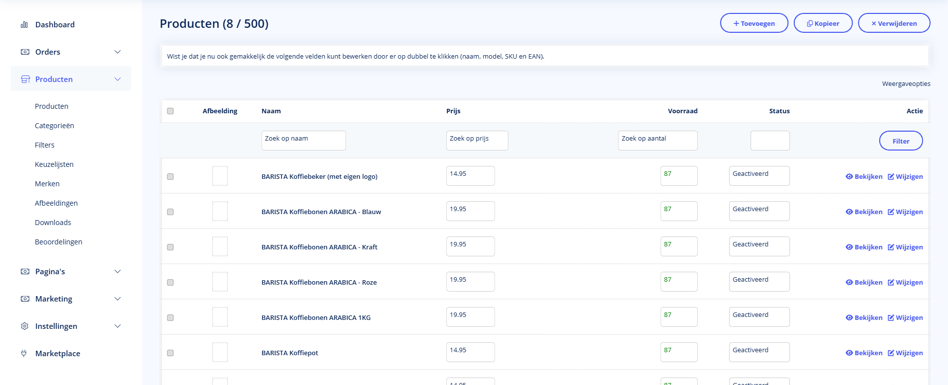 Het producten overzicht toont al je producten met de afbeelding, naam, prijs, voorraad en status (geactiveerd of uitgeschakeld). Je kunt producten snel vinden door te filteren op naam, prijs of aantal.